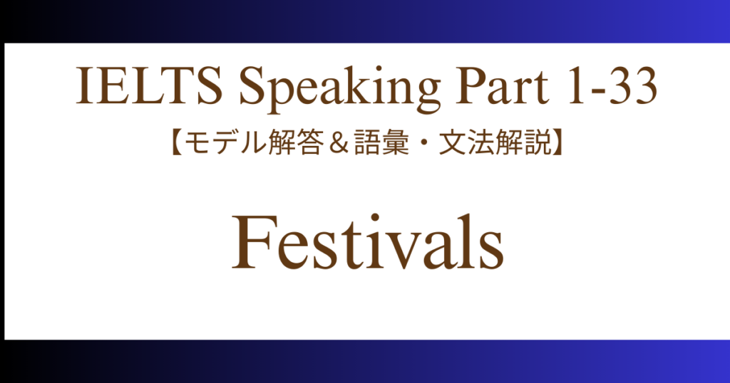 このシリーズでは、IELTS Speaking Part 1 の定番質問に対する自然なモデル解答を紹介しています。第33回のテーマは「Festivals(祭り・行事)」です。 💬 質問とモデル解答 Question Mo