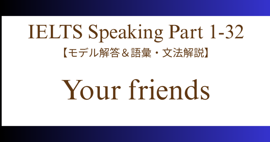 このシリーズでは、IELTS Speaking Part 1 の定番質問に対する自然なモデル解答を紹介しています。第32回のテーマは「Your Friends(友人関係)」です。 💬 質問とモデル解答 Question