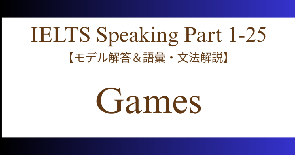 このシリーズでは、IELTS Speaking Part 1 の定番質問に対する自然なモデル解答を紹介しています。第25回のテーマは「Games(ゲーム)」です。 💬 質問とモデル解答 Question Model An