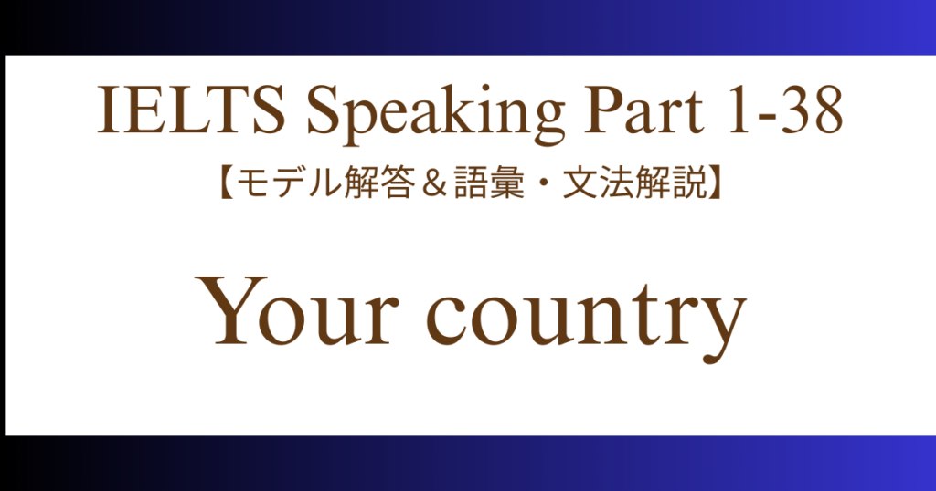 このシリーズでは、IELTS Speaking Part 1 の定番質問に対する自然なモデル解答を紹介しています。第38回のテーマは「Your Country(あなたの国)」です。 💬 質問とモデル解答 Question